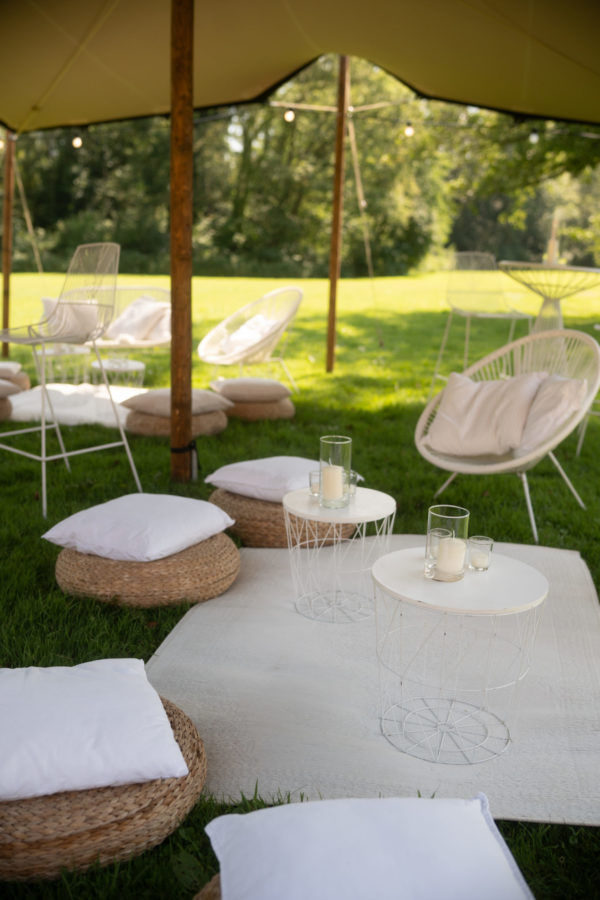 Klapptisch hell, Wishbone Style Chairs, Boden- und Dekokissen, Tischdecken, Servietten, Stehtisch weiß, Barhocker weiß, Caribic Lounge, Rattan Bodenhocker und die beige Getränkebar
